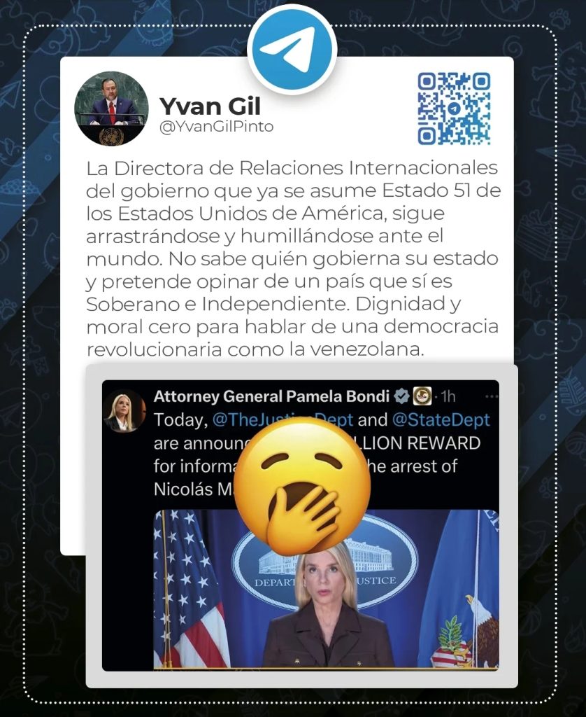 «Mientras nosotros desmontamos las tramas terroristas que se orquesta desde su país, esta señora sale con un circo mediático para complacer a la ultraderecha derrotada de Venezuela», dijo Gil, en alusión a Bondi.