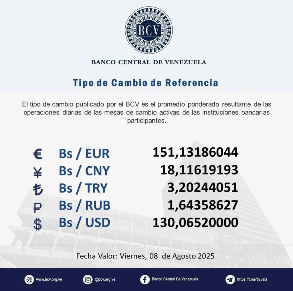 En su cuenta de Instagram, el Banco Central compartió la cotización que regirá los precios del día viernes 8 de agosto. Además, el precio del euro, ahora también usado por los venezolanos para fijar algunos precios, alcanzó los 151,31 bolívares.