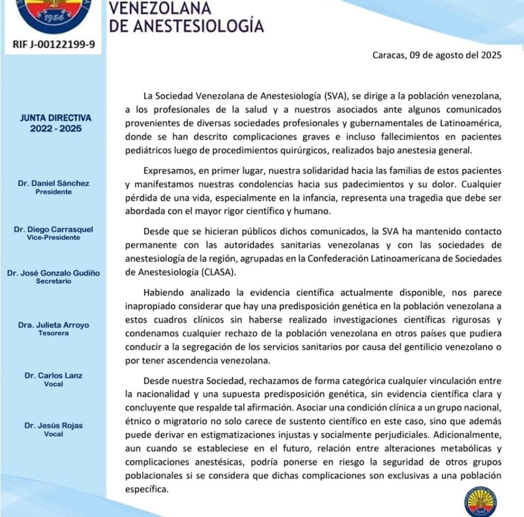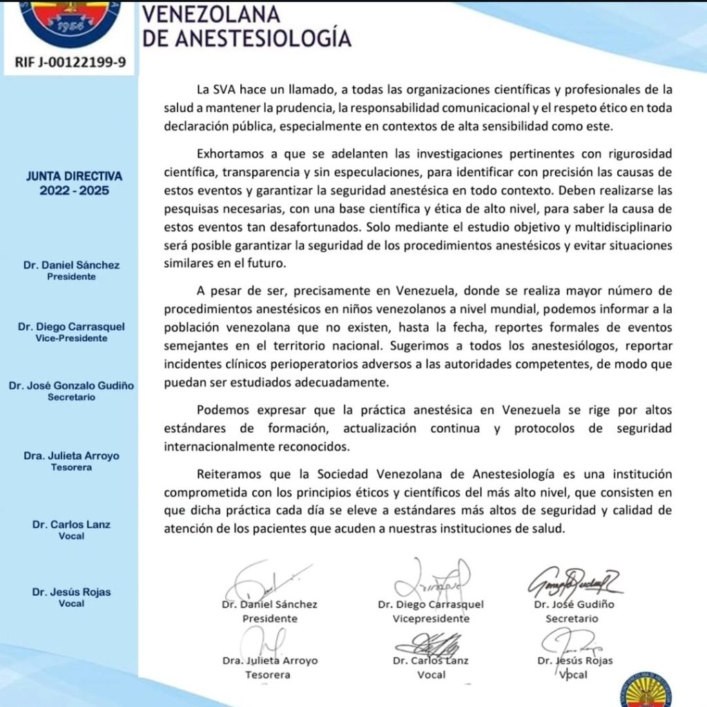 La Sociedad Venezolana de Anestesiología (SVA) publicó un comunicado el sábado 9 de agosto en donde pide una investigación, sin entrar en especulaciones, sobre la muerte de al menos cinco niños de nacionalidad venezolana en Chile tras haberse sometido a una intervención quirúrgica con anestesia general.
