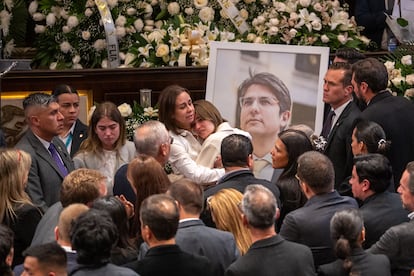 En el salón, lleno de coronas fúnebres y con dos grandes pantallas que muestran el rostro del político asesinado, también están familiares del senador y precandidato presidencial del partido de derecha Centro Democrático, entre ellos su esposa, María Claudia Tarazona, quien, al ingresar, se fundió en un abrazo con el padre del líder asesinado, Miguel Uribe Londoño.