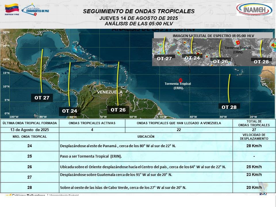 El Instituto Nacional de Meteorología e Hidrología (Inameh), ha anunciado la entrada de la onda tropical (OT) número 26 al territorio venezolano este jueves, 14 de agosto, pronosticando la posibilidad de lluvias y chubascos en varias regiones del país.
