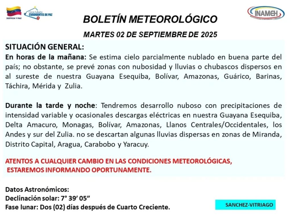 Se estiman cielos parcialmente nublados en buena parte del país, no obstante, se prevén lluvias o chubascos dispersos al sureste de Guayana Esequiba, Bolívar, Amazonas, Guárico, Barinas, Táchira, Mérida y Zulia.