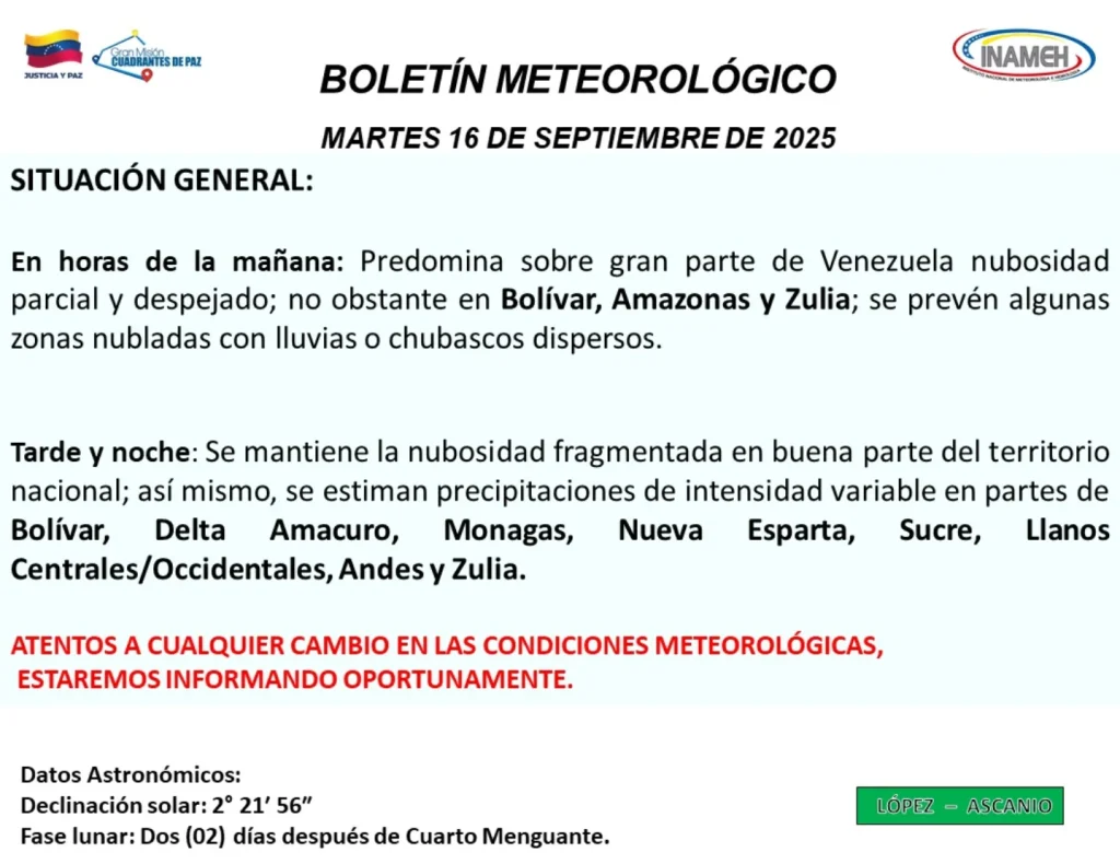 Estima que durante la mañana de este 16 de septiembre los cielos estarán con nubosidad parcial y despejado en gran parte del país. Asimismo, indicó que se prevén lluvias en algunas zonas de los estados Bolívar, Amazonas y Zulia.
