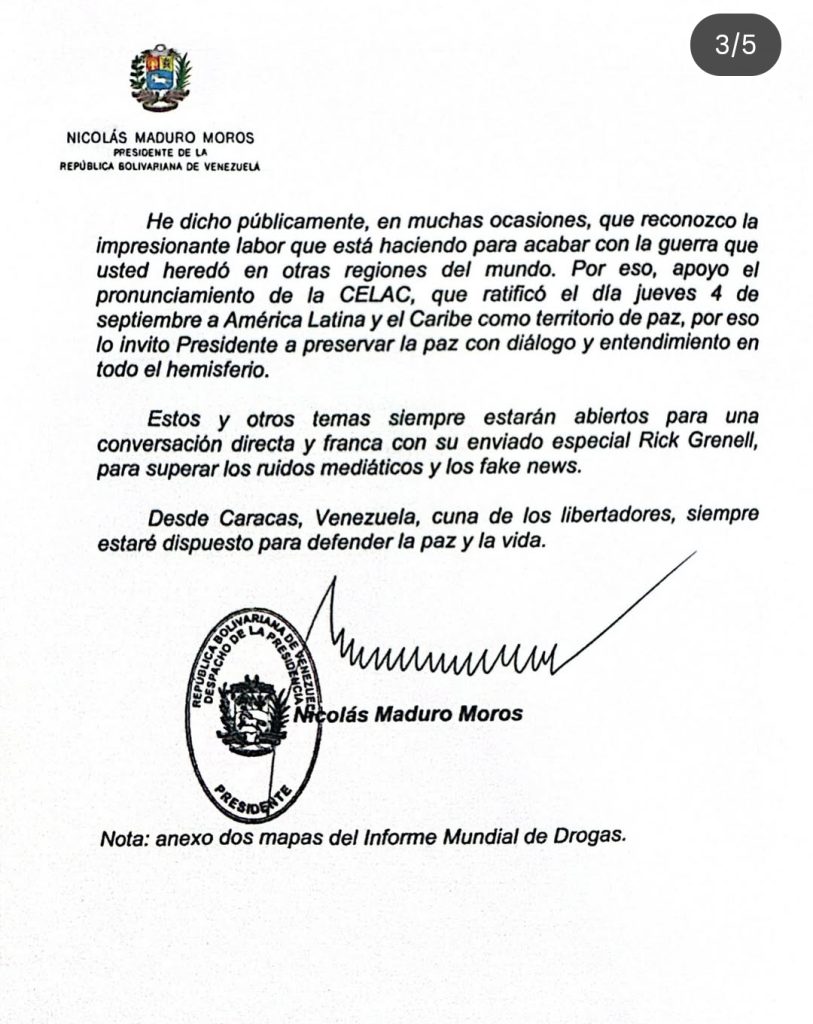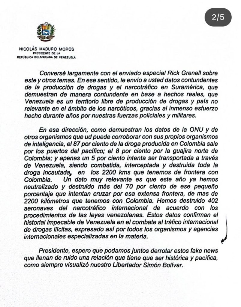 El Gobierno venezolano confirmó este domingo que el presidente Nicolás Maduro envió una carta a su homólogo estadounidense, Donald Trump, en la que dice estar dispuesto a mantener conversaciones directas con su enviado especial, Richard Grenell.