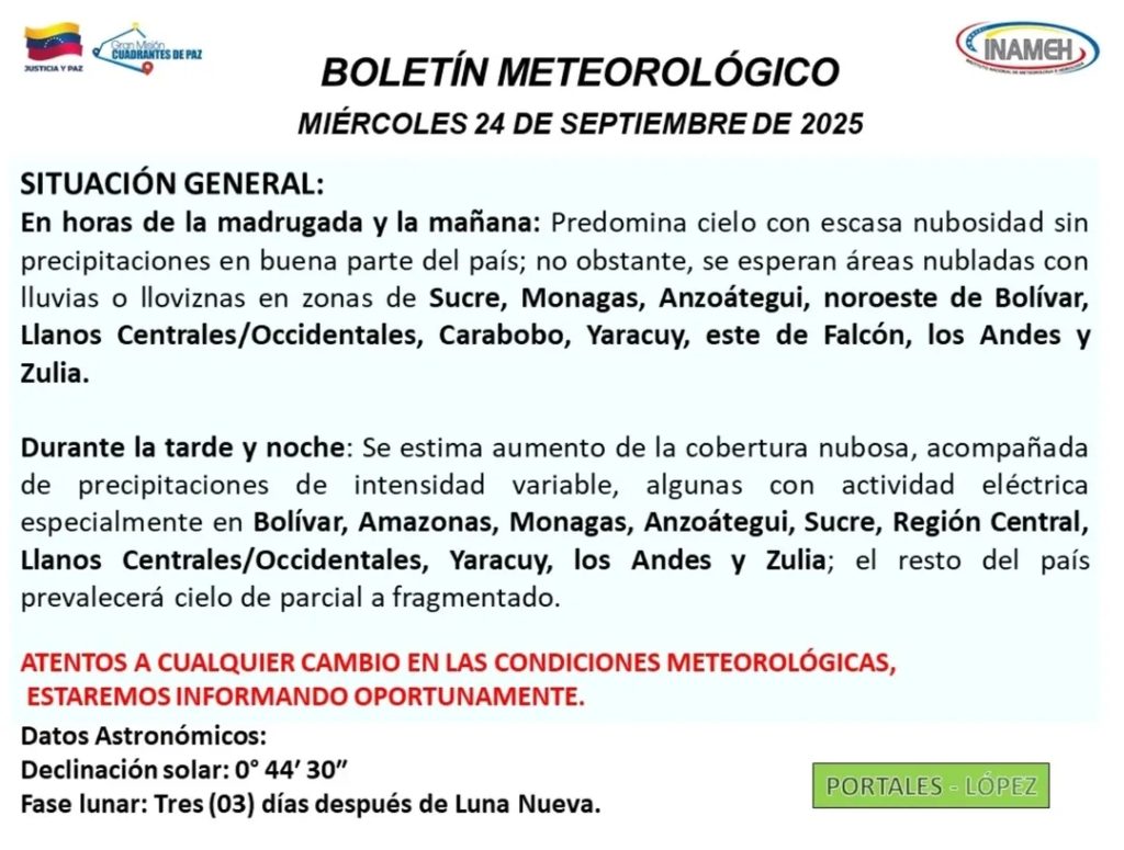 Durante la mañana, el Inameh indicó que hay previsiones de cielo con escasa nubosidad sin lluvias en buena parte del territorio nacional, aunque hay estimaciones de áreas nubladas asociadas a lluvias o lloviznas que afectarán zonas en Sucre, Monagas, Anzoátegui, noroeste de Bolívar; Llanos Centrales y Occidentales; Carabobo, Yaracuy, este de Falcón; los Andes y Zulia.