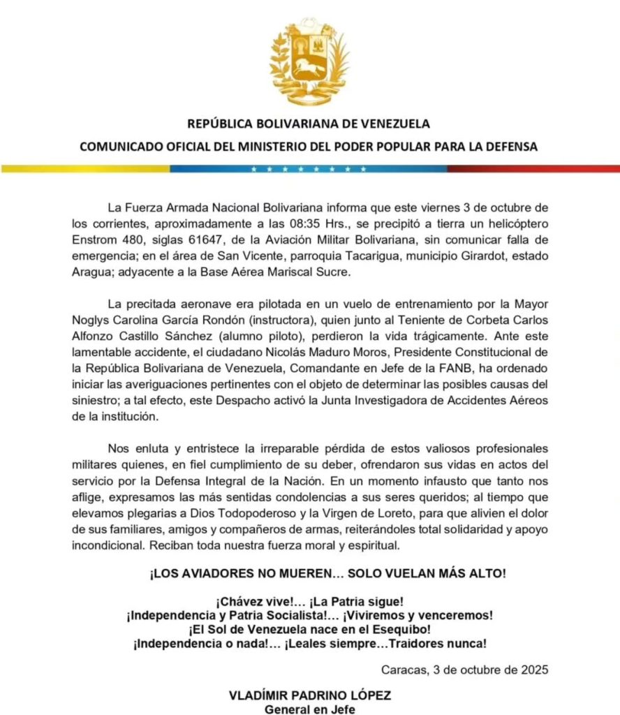Dos efectivos militares fallecieron este viernes luego de que un helicóptero de la Fuerza Armada Nacional Bolivariana (FANB) en el que viajaban se precipitara a tierra en el estado Aragua.
