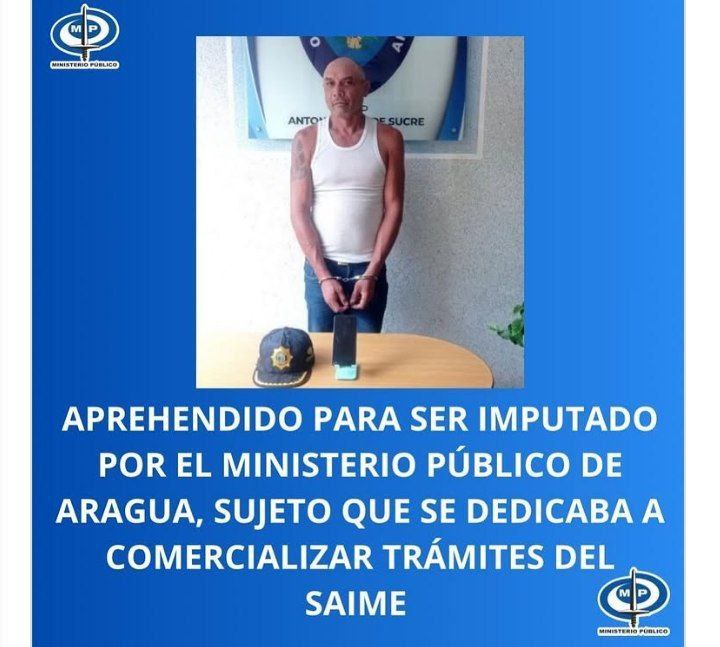 El detenido ha sido identificado como Freddy Ramírez. La acción se lleva a cabo tras encontrarse indicios de que este sujeto se dedicaba a la venta ilegal de cupos y a la agilización de trámites fraudulentos ante el Servicio Administrativo de Identificación, Migración y Extranjería (SAIME).