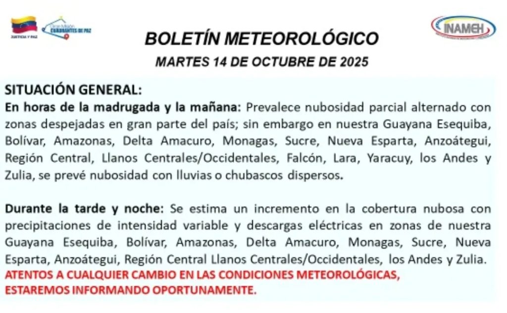 Asimismo, el Inameh señala que durante la tarde y noche se estima un incremento en la cobertura nubosa con precipitaciones de intensidad variable y descargas eléctricas en zonas de la Guayana Esequiba, Bolívar, Amazonas, Delta Amacuro, Monagas, Sucre, Nueva Esparta, Anzoátegui, Región Central Llanos Centrales/Occidentales, los Andes y Zulia.