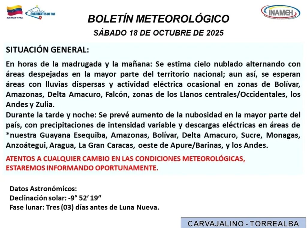 De igual forma, se señala que durante la tarde y noche se prevé aumento de la nubosidad en la mayor parte del país, con precipitaciones de intensidad variable y descargas eléctricas en áreas de la Guayana Esequiba, Amazonas, Bolívar, Delta Amacuro, Sucre, Monagas, Anzoátegui, Aragua, La Gran Caracas, oeste de Apure/Barinas, y los Andes.