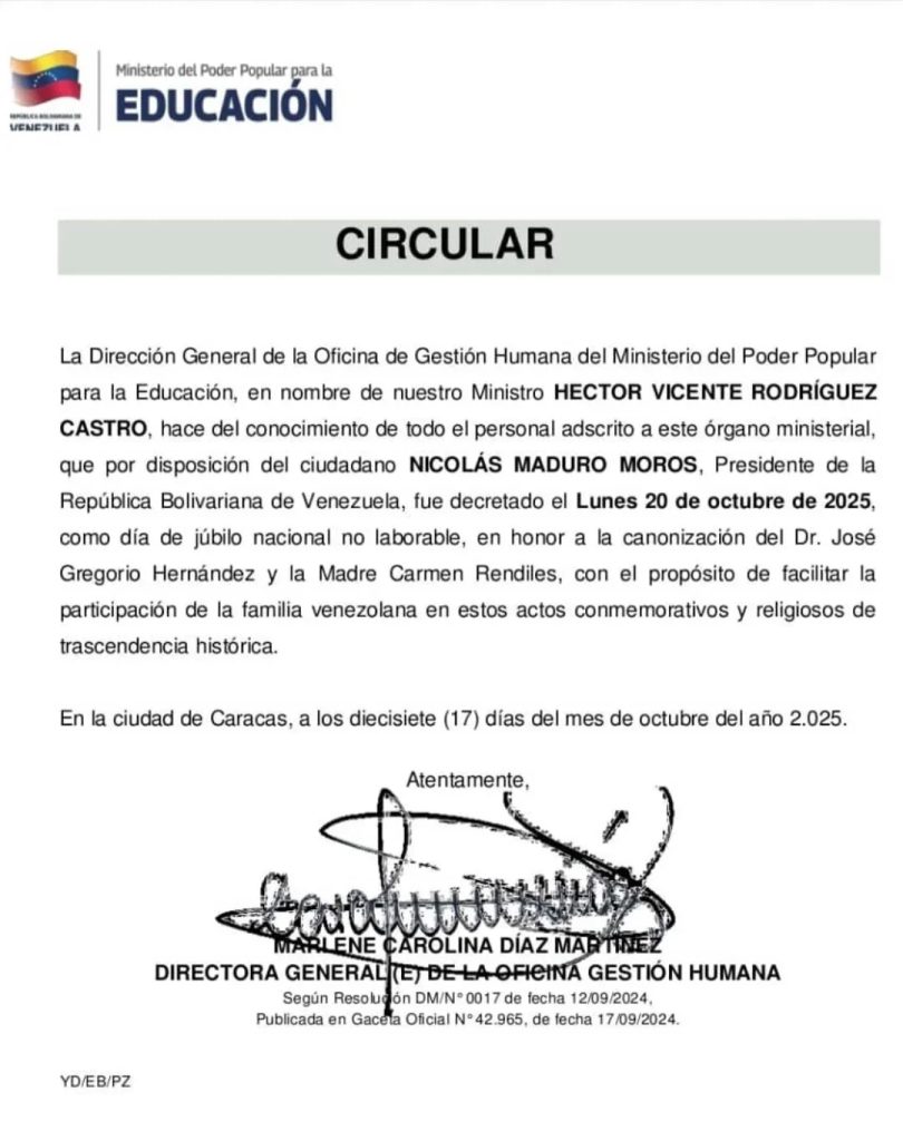 El Ministerio del Poder Popular para la Educación emitió este viernes una circular para informar a su personal sobre el decreto presidencial que establece el lunes 20 de octubre de 2025 como día de júbilo nacional y no laborable.