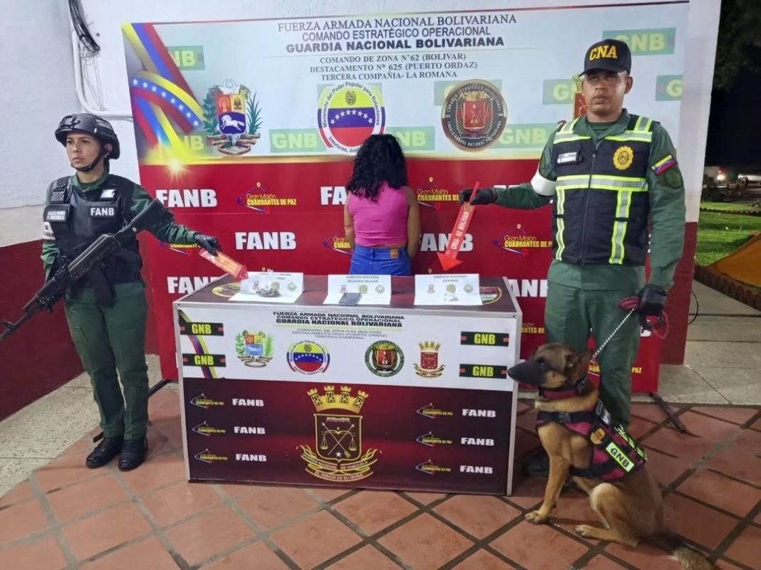 Efectivos de la Fuerza Armada Nacional Bolivariana (FANB), adscritos al Comando de Zona de la Guardia Nacional Bolivariana (GNB) Nro. 62 en el estado Bolívar, en un procedimiento coordinado con la Unidad Regional de Inteligencia Antidrogas (URIA) Nro. 62 (Bolívar), lograron la aprehensión de una ciudadana por posesión de sustancias estupefacientes y psicotrópicas.