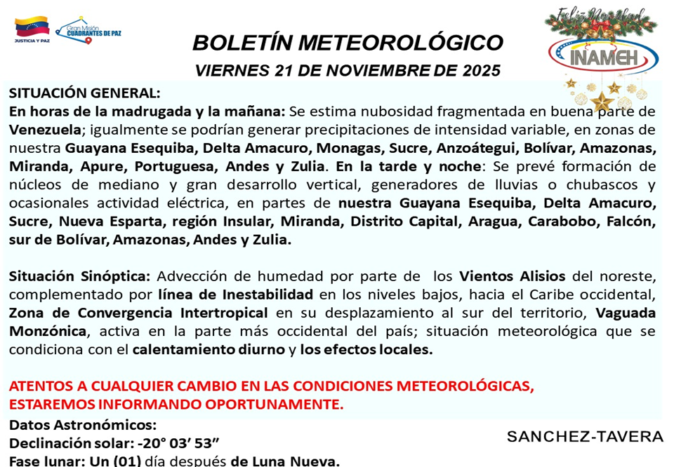 Este viernes en horas de la mañana se estima nubosidad fragmentada en gran parte del país; igualmente se podrían generar precipitaciones de intensidad variable, en zonas de la Guayana Esequiba, Delta Amacuro, Monagas, Sucre, Anzoátegui, Bolívar, Amazonas, Miranda, Apure, Portuguesa, Andes y Zulia, reseña el boletín del Instituto Nacional de Meteorología e Hidrología (Inameh).