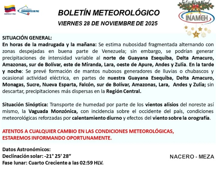 En horas de la mañana se estima nubosidad fragmentada al alternar con zonas despejadas en buena parte de Venezuela; sin embargo, se podrían generar precipitaciones de intensidad variable al norte de la Guayana Esequiba, Delta Amacuro, Amazonas, sur de Bolívar, este de Miranda, Lara, oeste de Apure, Andes y Zulia, señaló el boletín del Instituto Nacional de Meteorología e Hidrología (Inameh).