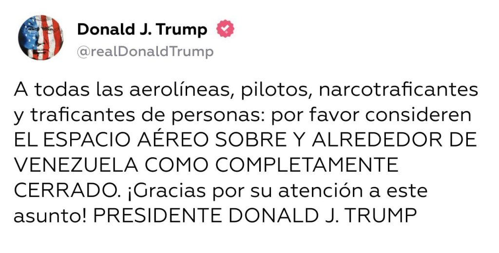 »A todas las aerolíneas, pilotos, narcotraficantes y traficantes de personas: por favor, consideren que el espacio aéreo sobre y alrededor de Venezuela está cerrado en su totalidad», escribió el mandatario en Truth Social.