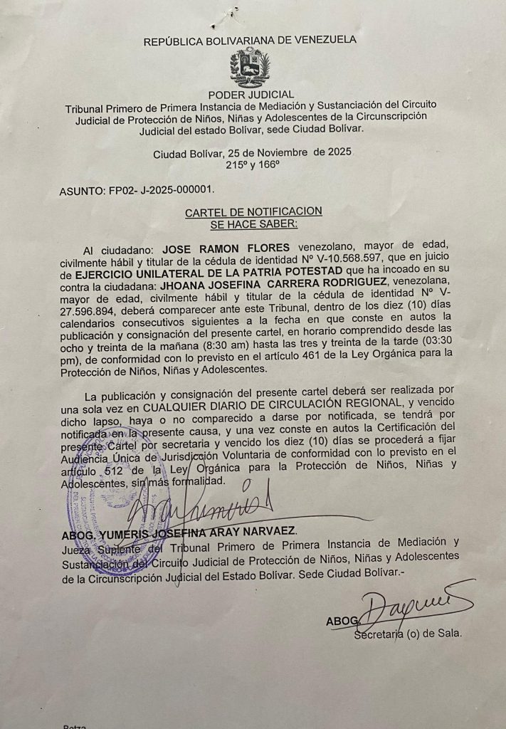 InicioAvisos Avisos Cartel de notificación 2 de diciembre de 2025 32 Divorcio por desafecto 4-12-25 Etiqueta BolívarCiudad Bolívar FacebookTwitterInstagramTiktokTelegramWhatsApp Artículo anteriorRealizan asamblea de emprendedores culturales en BolívarArtículo siguienteVenezuela suspende la actividad aerocomercial de Air Europa en el país Roelsi GudiñoPeriodista, Productora Audiovisual, Fotográfa, Marketing Digital, Creador Digital FacebookTwitterInstagramTiktokTelegramWhatsApp - PUBLICIDAD- Canal de Telegram