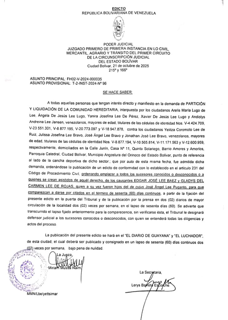 InicioAvisos Avisos Cartel de notificación| Participación y Liquidación 3 de diciembre de 2025 20 Divorcio por desafecto 4-12-25 Etiqueta BolívarCiudad BolívarCiudad GuayanaEdictosVenezuela FacebookTwitterInstagramTiktokTelegramWhatsApp Artículo anteriorConindustria solicitó incentivos fiscales y parafiscales para promover productividadArtículo siguienteRealizaron “Encuentro de Saberes y Haceres Pedagógicos Culturales” Roelsi GudiñoPeriodista, Productora Audiovisual, Fotográfa, Marketing Digital, Creador Digital FacebookTwitterInstagramTiktokTelegramWhatsApp - PUBLICIDAD- Canal de Telegram