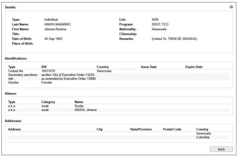 Según la Ofac, Araya Navarro, nacida el 5 de septiembre de 1983, fue incluida en la lista de sancionados por su papel como colaboradora y por su presunto vínculo con una de las compañías designadas: Global Import Solutions S.A., empresa registrada en Venezuela.