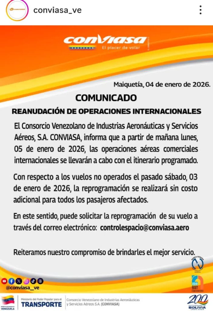 El Consorcio Venezolano de Industrias Aeronáuticas y Servicios Aéreos, S.A. (Conviasa), informa a la colectividad y a sus usuarios que, a partir de este lunes 05 de enero, todas sus operaciones aéreas comerciales tanto en rutas nacionales como internacionales se ejecutan de acuerdo con el itinerario programado.