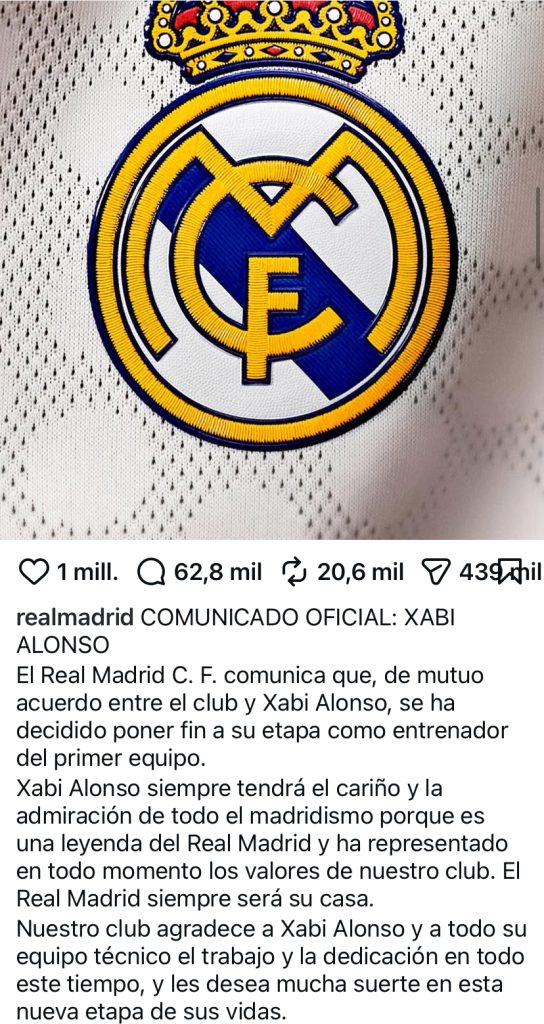 “El Real Madrid C. F. comunica que, de mutuo acuerdo entre el club y Xabi Alonso, se ha decidido poner fin a su etapa como entrenador del primer equipo”, señala el texto.