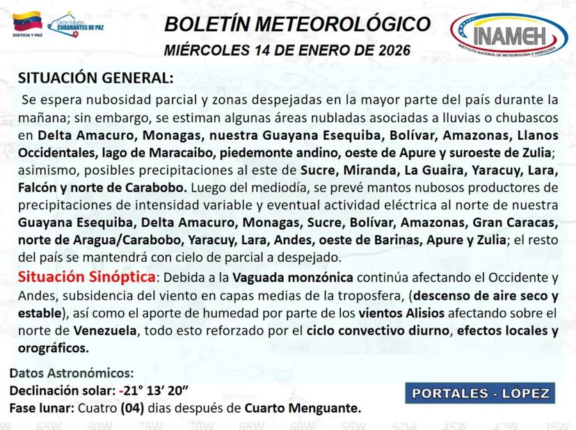 No obstante, se estiman mantos nubosos asociados a chubascos dispersos en zonas específicas de los Llanos Occidentales, el Lago de Maracaibo, el piedemonte andino y el suroeste de Zulia. Asimismo, sectores de Miranda, La Guaira, Yaracuy, Lara y Falcón podrían registrar precipitaciones débiles antes del inicio de la tarde.