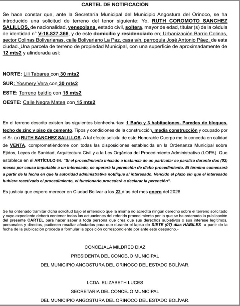 InicioAvisos Avisos Cartel de notificación municipal 23 de enero de 2026 24 Venta de terreno 23.01.2026 Concejo Municipal Angostura del Orinoco Etiqueta BolívarCiudad Bolívar FacebookTwitterInstagramTiktokTelegramWhatsApp Artículo anteriorEEUU consuma su salida de la OMSArtículo siguienteEstos son los resultados de la jornada del 22Ene en el Round Robin Roelsi GudiñoPeriodista, Productora Audiovisual, Fotográfa, Marketing Digital, Creador Digital FacebookTwitterInstagramTiktokTelegramWhatsApp - PUBLICIDAD- Canal de Telegram