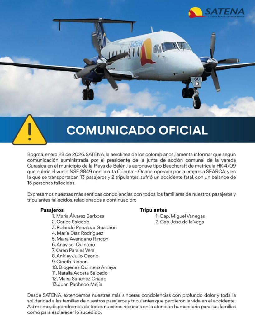 El avión de la compañía colombiana Satena que desapareció este miércoles en el departamento de Norte de Santander (fronterizo con Venezuela) fue hallado accidentado con sus 15 pasajeros desaparecidos, confirmaron las autoridades.