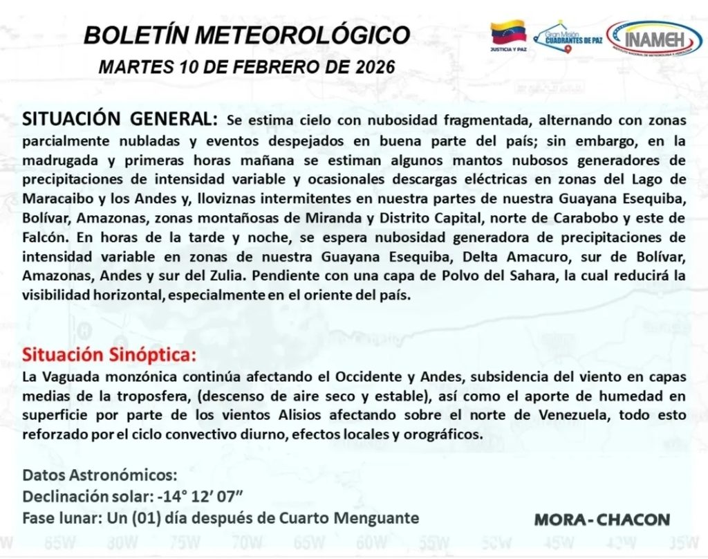 El reporte oficial publicado en el canal de Telegram del Inameh indica que buena parte de Venezuela mantendrá un cielo de nubosidad fragmentada, aunque se esperan descargas eléctricas puntuales en los Andes y la zona del Lago de Maracaibo durante la madrugada y la mañana.