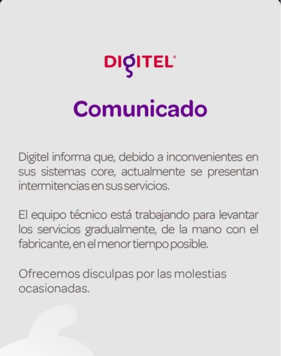 La operadora Digitel ha reportado una falla técnica masiva este miércoles 11 de febrero de 2026, la cual afecta principalmente la navegación de datos y el acceso a sus plataformas de autogestión.