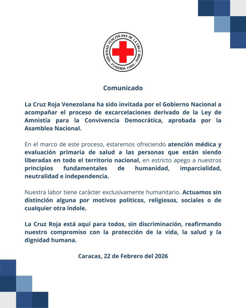 La Cruz Roja Venezolana informó esta tarde, mediante un comunicado, que las autoridades que encabezan el actual gobierno interino le extendieron una invitación para acompañar las excarcelaciones derivadas de la Ley de Amnistía aprobada el pasado jueves, 20 de febrero, en el seno de la Asamblea Nacional.