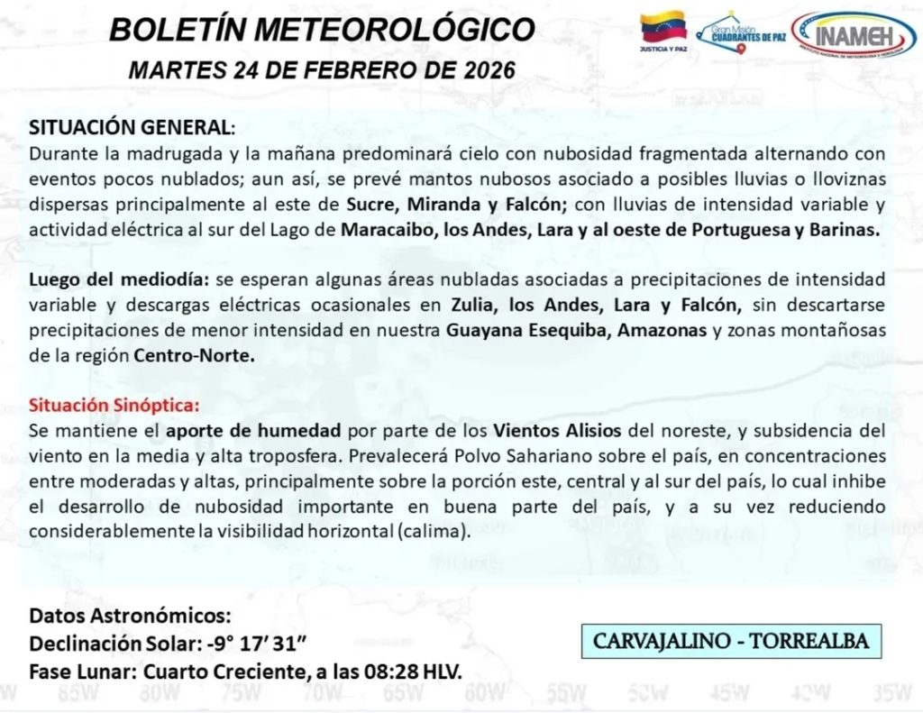 Las autoridades meteorológicas publicaron también que los mantos nubosos afectarán principalmente el este de los estados Sucre, Miranda y Falcón, mientras que se esperan precipitaciones de intensidad variable con actividad eléctrica al sur del lago de Maracaibo, Los Andes, Lara y al oeste de Portuguesa y Barinas.