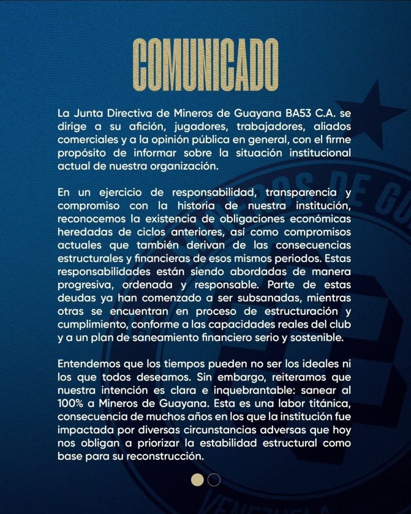 La Junta Directiva de Mineros de Guayana emitió un comunicado este domingo en el que recalcó que se encuentran en un proceso de reestructuración y saneamiento financiero, a fin de que el equipo pueda retomar su completo accionar dentro de la Liga FutVE.
