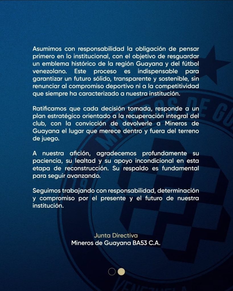 Por ello, Mineros de Guayana aseguró que este paso es indispensable a fin de poder garantizar «un futuro sólido, transparente y sostenible» sin que eso signifique renunciar al compromiso deportivo ni a su competitividad.