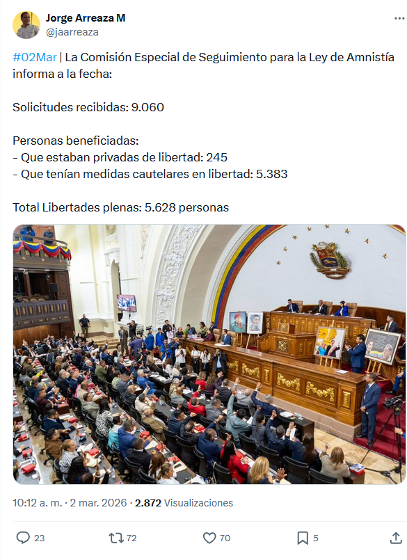 El presidente de la Comisión Especial de Seguimiento de la Ley de Amnistía para la Convivencia Democrática, Jorge Arreaza, informó que un total de cinco mil 628 personas han obtenido la libertad plena tras la ejecución de este instrumento legal.