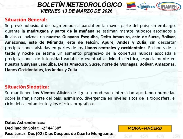 Este viernes se prevé nubosidad de fragmentada a parcial en la mayor parte del país; sin embargo, durante la madrugada y parte de la mañana se estiman mantos nubosos asociados a lluvias o lloviznas en la Guayana Esequiba, Delta Amacuro, este de Sucre, Bolívar, Amazonas, este de Miranda, este de Falcón, Apure, Andes y Zulia, sin descartar precipitaciones aisladas en partes de los Llanos centrales y occidentales.