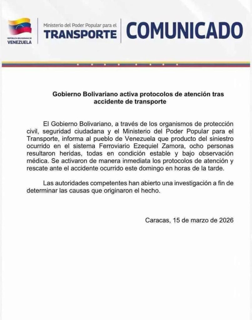 Este domingo el Gobierno nacional a través de los organismos de Protección Civil, seguridad ciudadana y el Ministerio del Poder Popular para el Transporte, activó los protocolos de atención y rescate ante el accidente ferroviario registrado, en horas de la tarde, en el sistema Ezequiel Zamora.