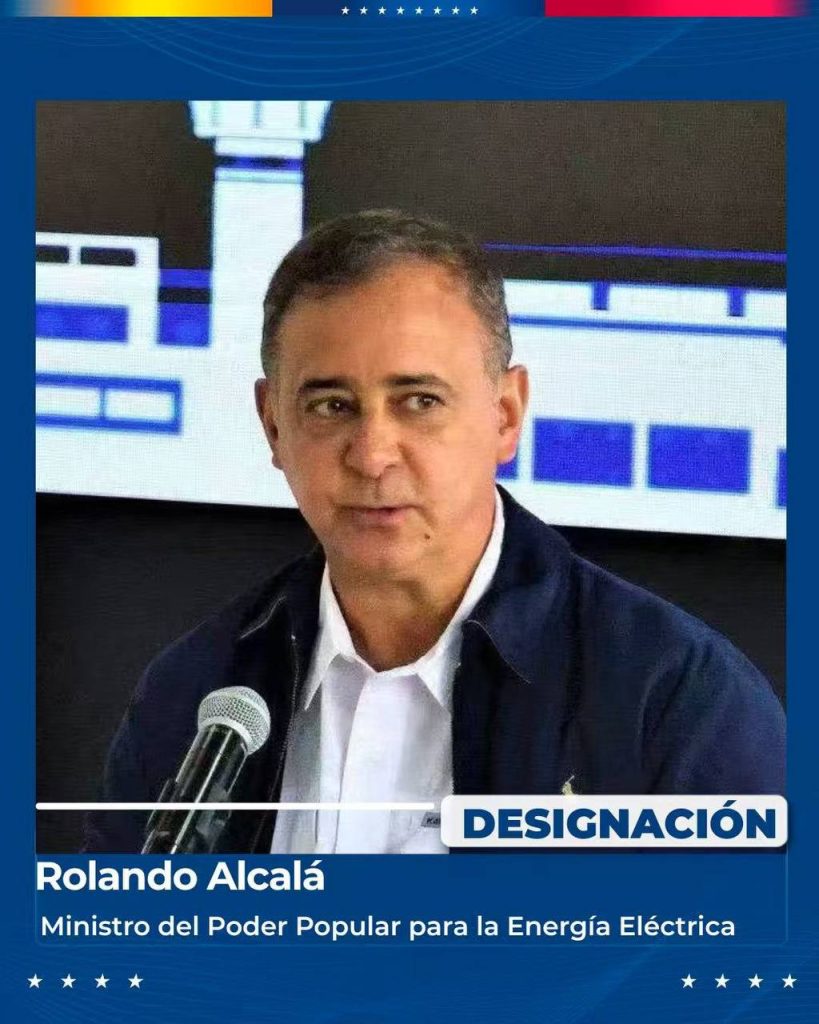 «He designado como nuevo Ministro del Poder Popular para la Energía Eléctrica a Rolando Alcalá, ingeniero electricista de la Universidad Simón Bolívar y especialista de proyectos eléctricos con gran experiencia nacional e internacional. Ahora asume el compromiso y la responsabilidad de seguir fortaleciendo el Sistema Eléctrico Nacional de nuestro país.»