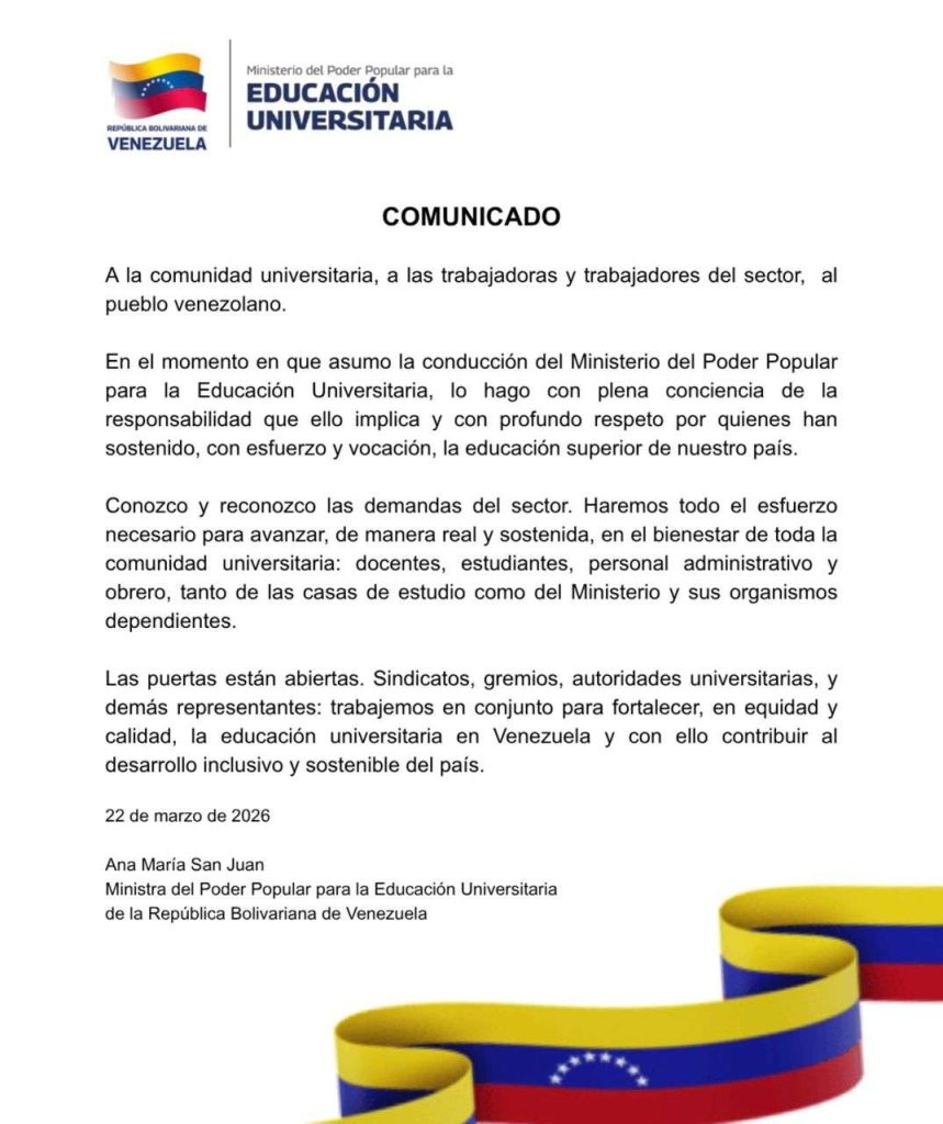 La recién designada Ministra del Poder Popular para la Educación Universitaria, Ana María Sanjuán, emitió un comunicado oficial en el que extiende una invitación abierta a todos los sectores que hacen vida en las casas de estudio del país para articular esfuerzos en pro de la excelencia académica.