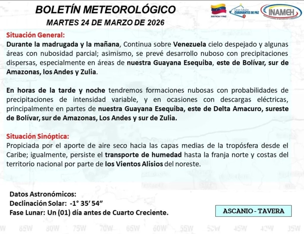 Autoridades del Instituto Nacional de Meteorología e Hidrología (Inameh) reporta que el territorio venezolano mantiene condiciones climáticas estables durante las primeras horas del día con cielo mayormente despejado, reseñó una publicación en el canal de Telegram de la institución.