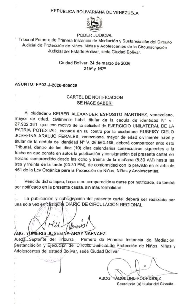 InicioAvisos Avisos Cartel de notificación | Patria potestad 25 de marzo de 2026 4 25.03.2026 Etiqueta BolívarCiudad BolívarCiudad GuayanaVenezuela FacebookTwitterInstagramTiktokTelegramWhatsApp Artículo anteriorCartel de notificación | DivorcioArtículo siguienteDesignan a Coromoto Godoy como embajadora de Venezuela ante la ONU Roelsi GudiñoPeriodista, Productora Audiovisual, Fotográfa, Marketing Digital, Creador Digital FacebookTwitterInstagramTiktokTelegramWhatsApp - PUBLICIDAD-