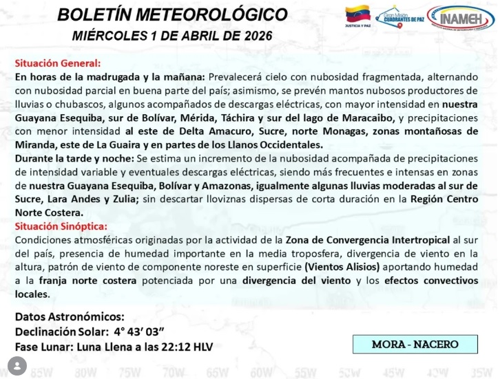Durante la tarde y noche se estima un incremento de la nubosidad acompañada de precipitaciones de intensidad variable y eventuales descargas eléctricas, al ser más frecuentes e intensas en zonas de la Guayana Esequiba, Bolívar y Amazonas.