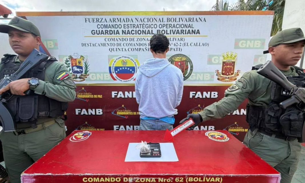 Efectivos de la FANB, adscritos al CZGNB-62, detuvieron a un ciudadano en el PAC «Río Miamo» por presunto tráfico de sustancias estupefacientes.