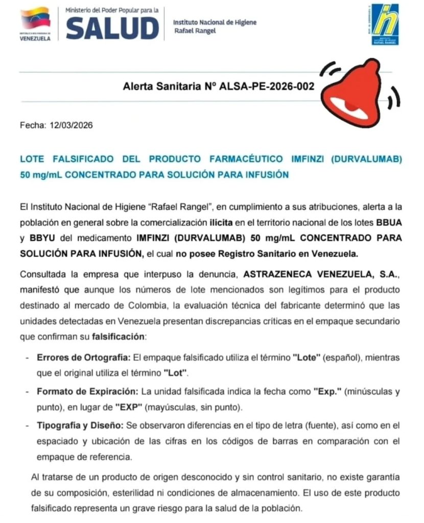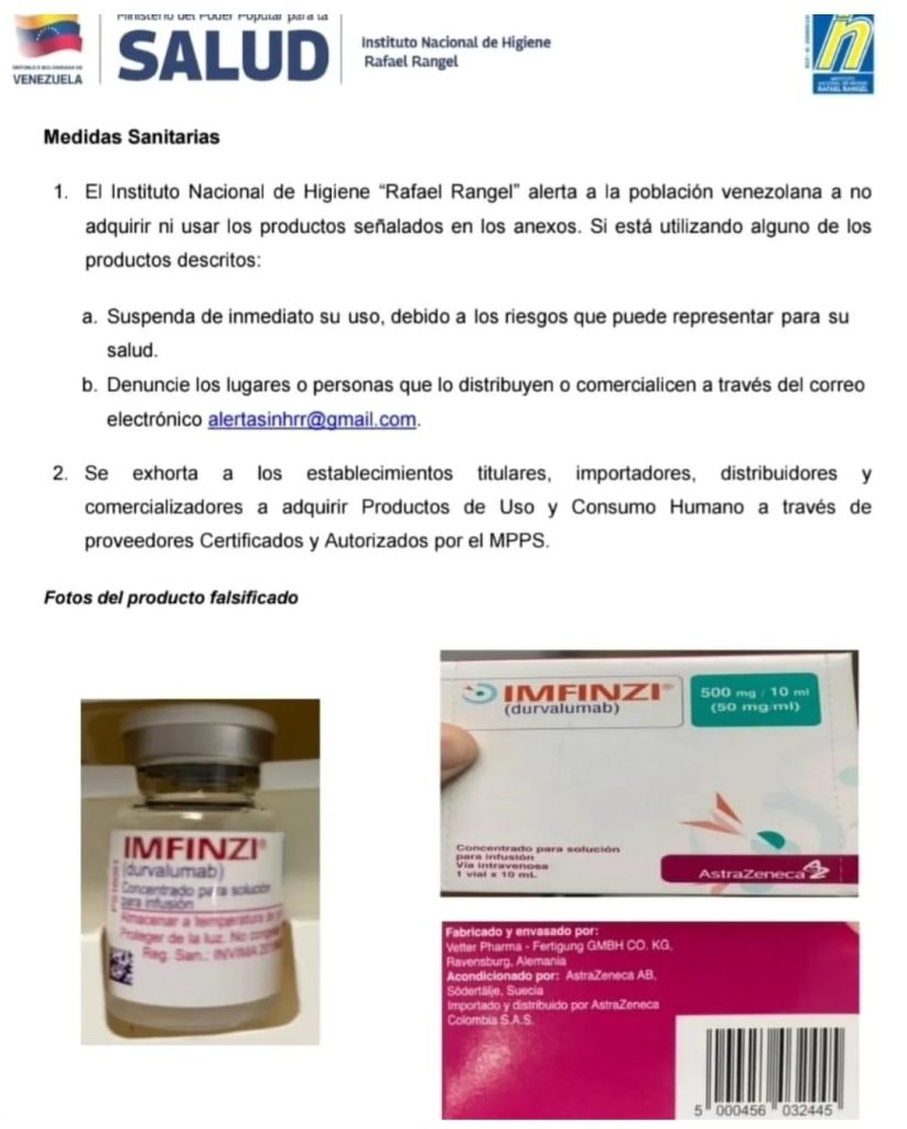 Recientemente, el Instituto Nacional de Higiene Rafael Rangel, ente adscrito al Ministerio para la Salud, emitió una alerta sanitaria a la población sobre la comercialización ilícita en el país de los lotes «BBUA y BBYU» del medicamento «IMFINZI» (Durvalumab) de 50 mg/ml, concentrado de solución para infusión, el cual no posee regulación sanitaria en Venezuela.
