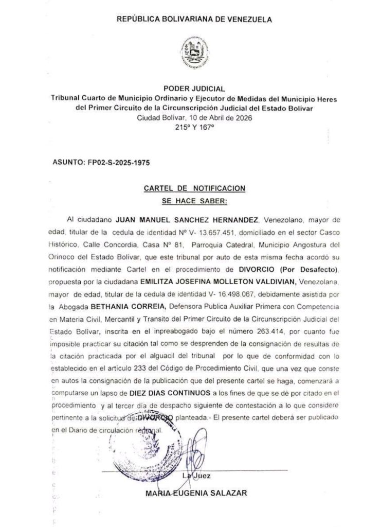 InicioAvisos Avisos Cartel de notificación | Divorcio por desafecto 14 de abril de 2026 19 14.04.2026 Etiqueta BolívarCiudad BolívarCiudad GuayanaVenezuela FacebookTwitterInstagramTiktokTelegramWhatsApp Artículo anteriorPDVSA Y Chevron firman acuerdo para el fortalecimiento de empresas mixtasArtículo siguienteSe prevé para este martes nubosidad parcial en gran parte del territorio nacional Roelsi GudiñoPeriodista, Productora Audiovisual, Fotográfa, Marketing Digital, Creador Digital FacebookTwitterInstagramTiktokTelegramWhatsApp - PUBLICIDAD-