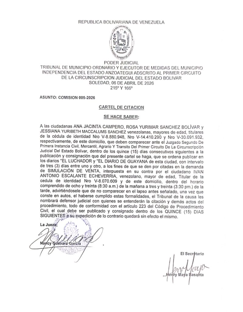 InicioAvisos Avisos Cartel de notificación | Demanda por simulación de venta 15 de abril de 2026 9 15.04.2026 Etiqueta BolívarCiudad BolívarCiudad Guayana FacebookTwitterInstagramTiktokTelegramWhatsApp Artículo anteriorSube y baja: Petróleo WTI se desplomó a 91,28 dólares por barrilArtículo siguienteSector telecomunicaciones alerta sobre la urgencia de acceso a divisas Roelsi GudiñoPeriodista, Productora Audiovisual, Fotográfa, Marketing Digital, Creador Digital FacebookTwitterInstagramTiktokTelegramWhatsApp - PUBLICIDAD-