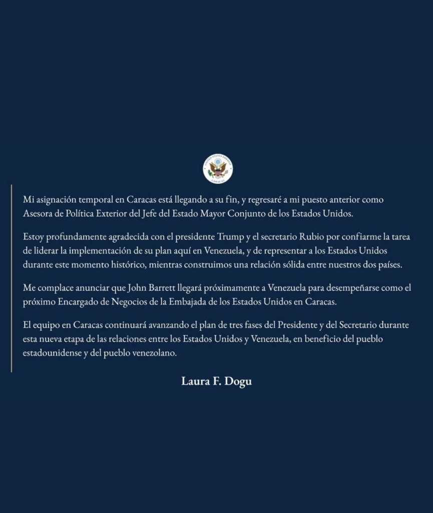 La encargada de Negocios de EE. UU. en Venezuela, Laura Dogu, confirmó este miércoles su salida de la embajada en el país, a pesar de que el martes un funcionario de Washington negó que abandonaría su cargo.