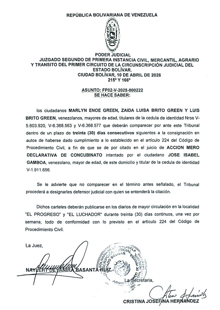 InicioAvisos Avisos Cartel de notificación | Declarativo de concubinato 16 de abril de 2026 8 16.04.2026 Etiqueta BolívarCiudad Bolívar FacebookTwitterInstagramTiktokTelegramWhatsApp Artículo anteriorCartel de notificación | Terreno municipalArtículo siguienteJorge Arreaza: Ley de Amnistía 2026 busca romper el «círculo vicioso» y consolidar la paz Roelsi GudiñoPeriodista, Productora Audiovisual, Fotográfa, Marketing Digital, Creador Digital FacebookTwitterInstagramTiktokTelegramWhatsApp - PUBLICIDAD-