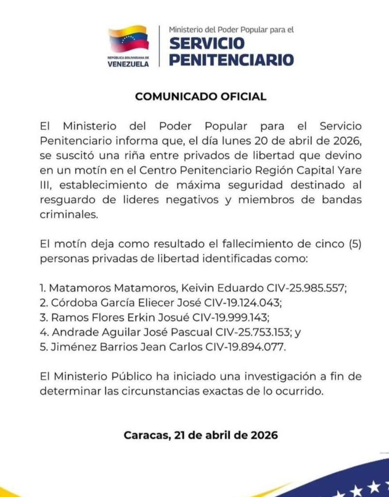 El Ministerio del Poder Popular para el Servicio Penitenciario ha emitido un comunicado oficial confirmando la muerte de cinco internos durante los hechos violentos registrados este lunes 20 de abril en el Centro Penitenciario Región Capital Yare III, ubicado en el estado Miranda.