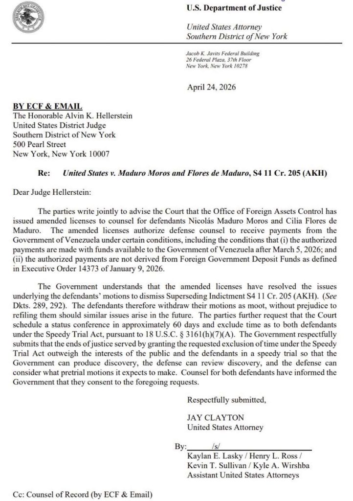 “Las partes notifican conjuntamente al tribunal que la Oficina de Control de Activos Extranjeros (OFAC) ha emitido licencias modificadas relativas a los servicios legales prestados a Nicolás Maduro y Cilia Flores. Dichas licencias modificadas permiten a los abogados defensores recibir pagos del gobierno venezolano bajo ciertas condiciones”.