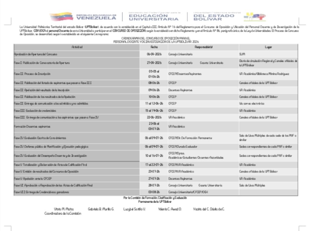 InicioAvisos Avisos Cronograma de concurso de la UPTBOLíVAR 27 de abril de 2026 6 24.04.2026 Etiqueta BolívarCiudad BolívarVenezuela FacebookTwitterInstagramTiktokTelegramWhatsApp Artículo anteriorOmailyn Alcalá se convierte en la primera venezolana en conquistar una Copa del Mundo de BoxeoArtículo siguientePrecio del petróleo supera los US$ 108 pese a la nueva propuesta de negociación de Irán a EE. UU. Francys Hernández FacebookTwitterInstagramTiktokTelegramWhatsApp - PUBLICIDAD-