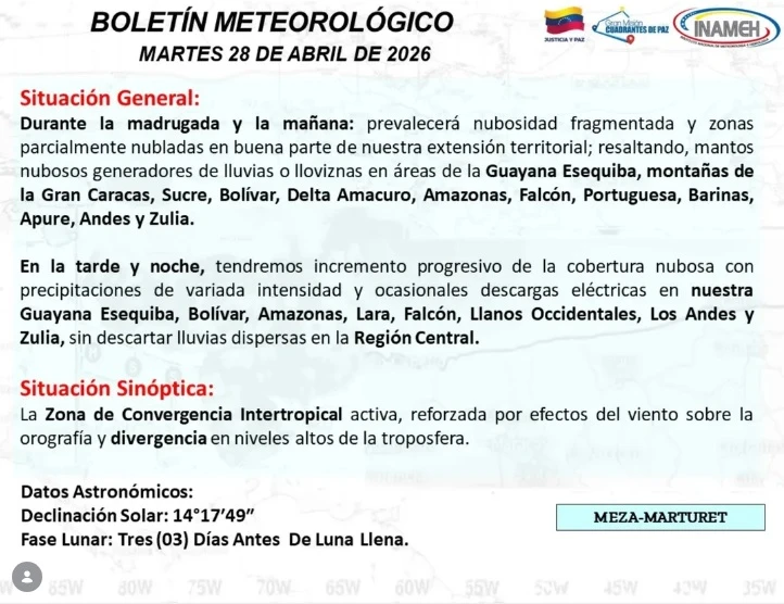 Este martes, durante la mañana, prevalecerá nubosidad fragmentada y zonas parcialmente nubladas en buena parte del territorio nacional, al resaltar mantos nubosos generadores de lluvias o lloviznas en áreas de la Guayana Esequiba, montañas de la Gran Caracas, Sucre, Bolívar, Delta Amacuro, Amazonas, Falcón, Portuguesa, Barinas, Apure, Andes y Zulia.
